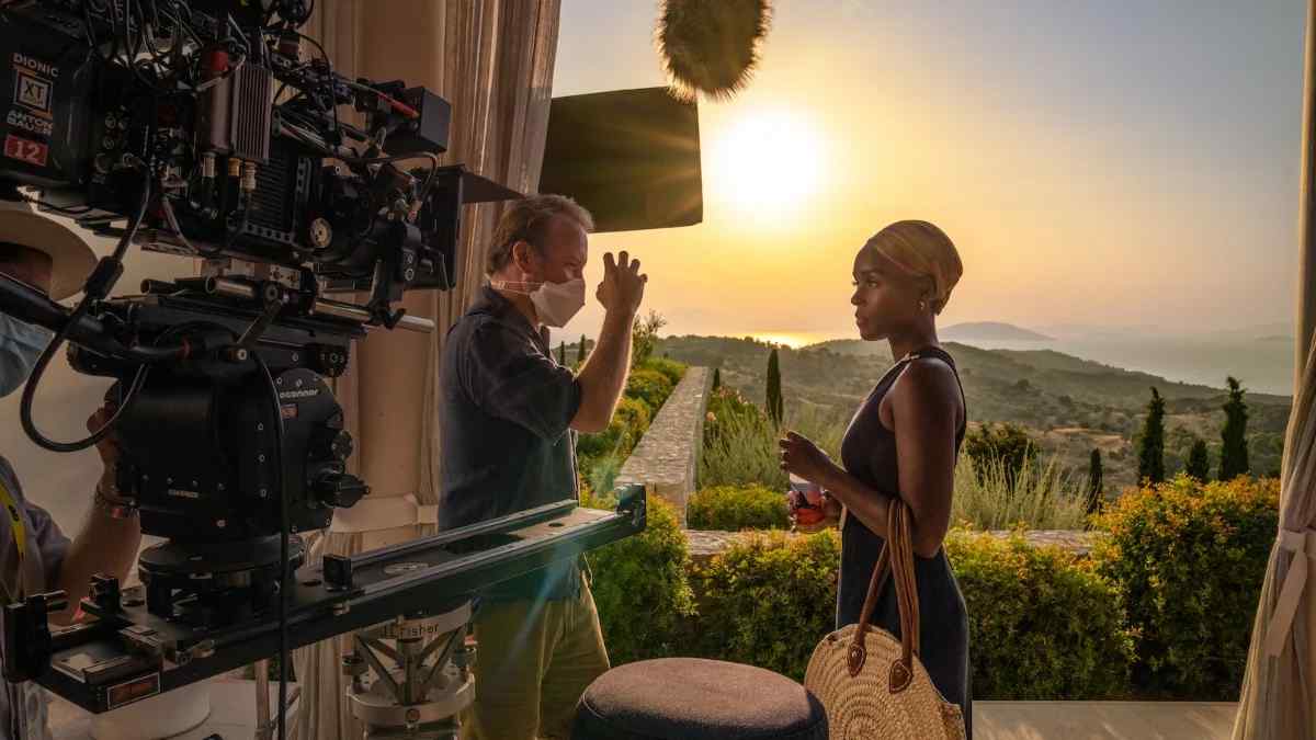 En la segunda imagen, tenemos a Janelle Monáe con el telón de fondo de una puesta de sol griega, conversando con Johnson, que parece compartir su visión creativa mientras se desarrolla la escena. Podemos ver de cerca una plataforma móvil de J. L. Fisher, un trípode de alta tecnología de OConnor y una cámara cinematográfica de última generación. Siempre es bueno ir detrás de las cámaras de vez en cuando para apreciar un poco más el proceso de filmación.