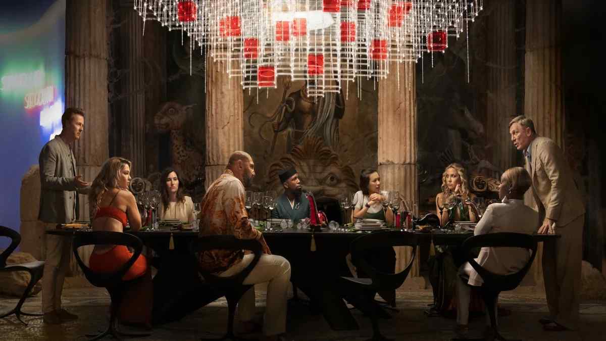En la primera imagen, vemos al nuevo reparto compuesto por Edward Norton, Janelle Monáe, Kathryn Hahn, Leslie Odom Jr., Jessica Henwick, Madelyn Cline, Kate Hudson y Dave Bautista reunidos alrededor de una larga mesa de comedor para lo que parece ser una intervención organizada por el detective Blanc de Daniel Craig.